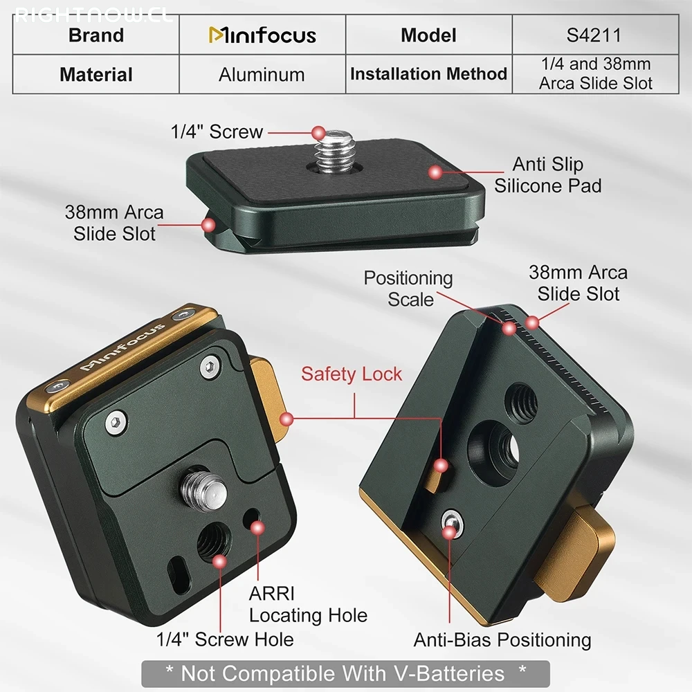 Diseño versátil: La placa superior tiene un tornillo de 1/4" compatible con cámaras, jaulas, monitores, etc. La base puede montarse con tornillos de 1/4" y también tiene un orificio de localización Arri, lo que permite una mayor variedad de configuraciones.