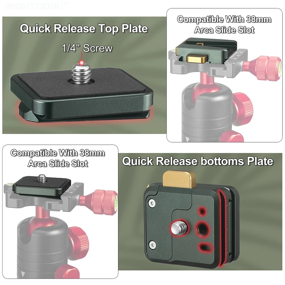 Sistema de liberación rápida: Kit de dos partes (placa superior y base) que te permite montar y desmontar tu equipo de forma rápida y sencilla. Ambas piezas tienen ranuras tipo cola de milano (dovetail grooves).