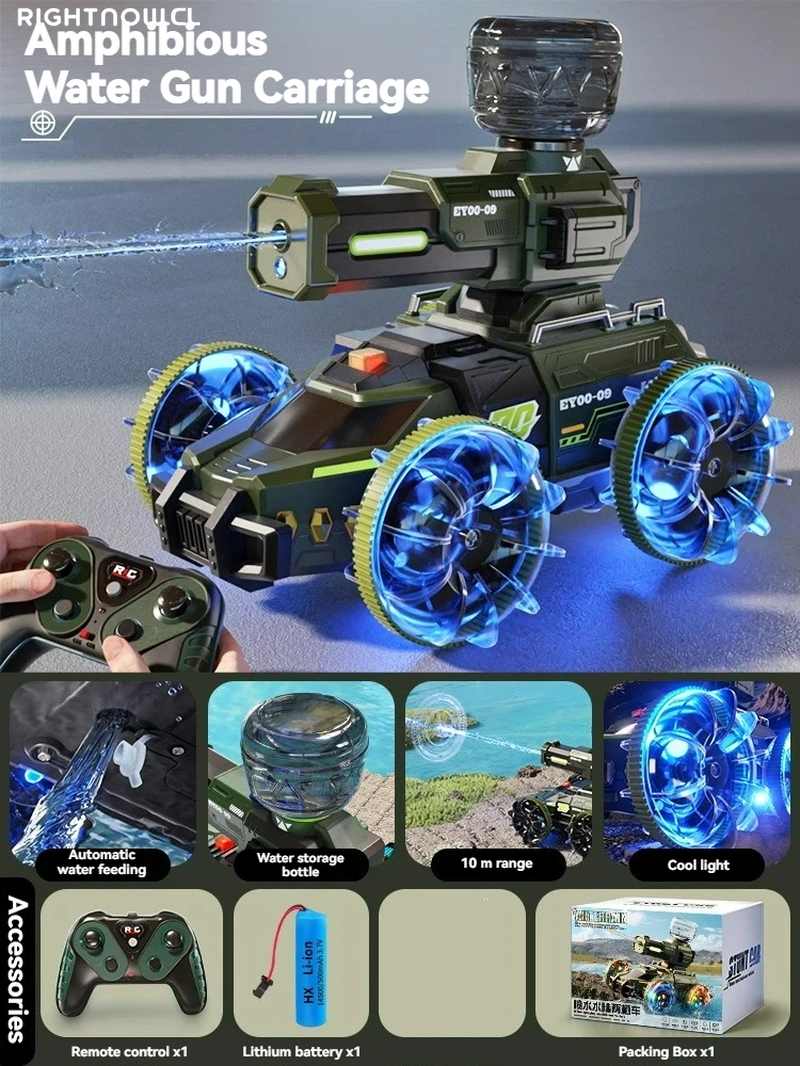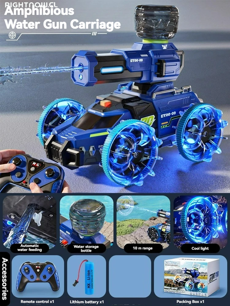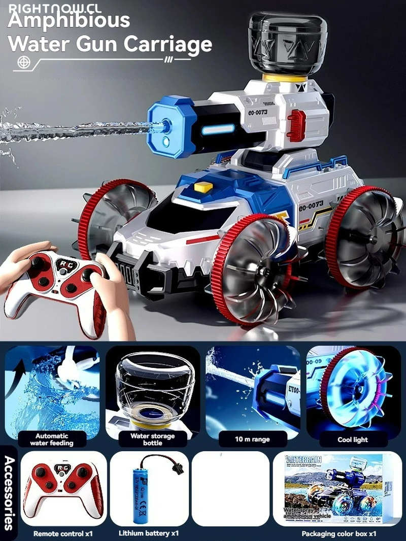 Nombre: Vehículo anfibio lanza agua.Materiales: Plástico con componentes electrónico.Funciones: Lanza agua, tiene luces y es controlado por control remoto.Distancia Máxima... Leer más...