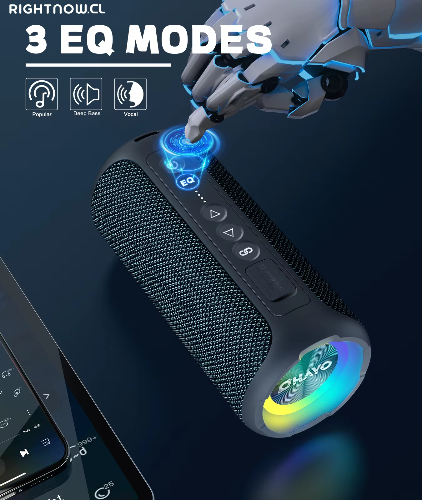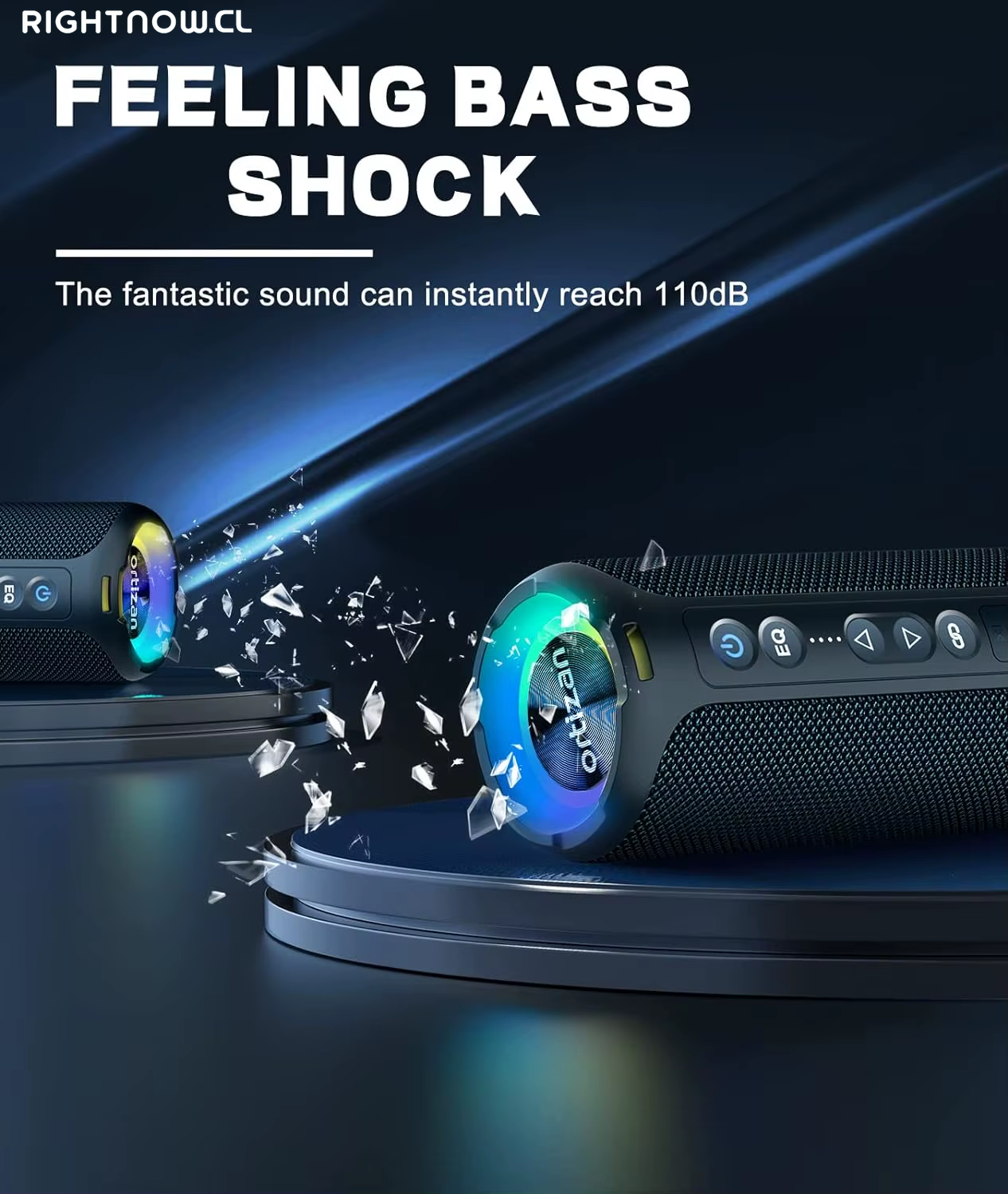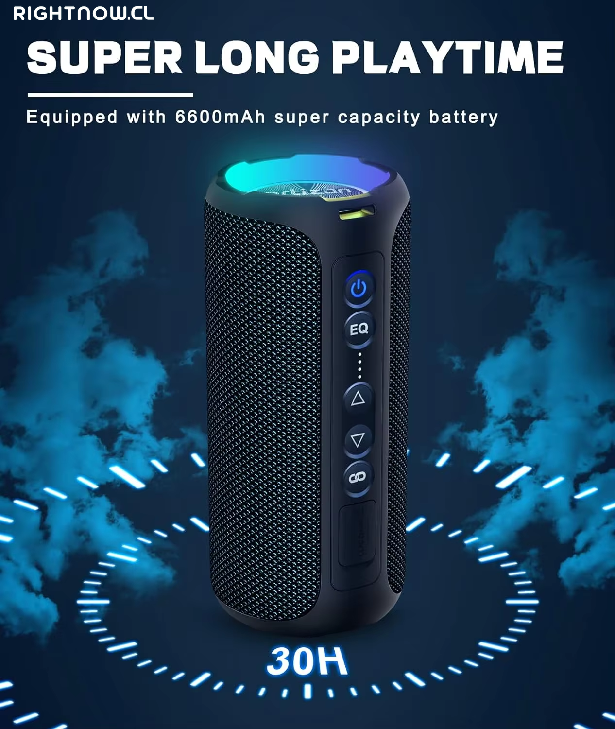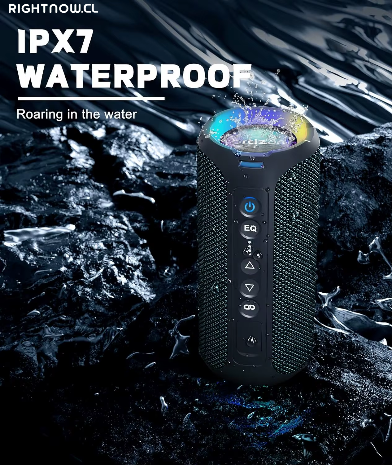Resistente al agua: Con su certificación IPX7, el parlante es completamente impermeable, ideal para la ducha, la piscina o actividades al aire libre sin preocupaciones.