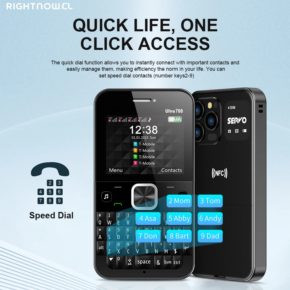 Redescubre la simplicidad y eficiencia con el Ultra700! Este teléfono móvil, con su clásico teclado QWERTY completo, es la solución perfecta para quienes buscan funcionalidad y comodidad. Incorpora 4 ranuras SIM, lo que lo hace ideal para gestionar varios números, ya sea para el trabajo, uso personal o viajes. Además, cuenta con NFC para control de acceso, simplificando tus entradas y salidas diarias